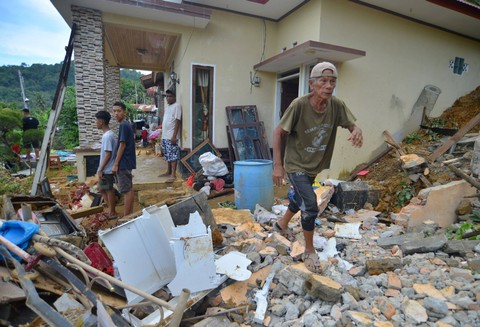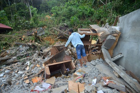 Warga melihat kondisi rumah yang hancur akibat longsor di Mato Aia, Padang, Sumatera Barat, Sabtu (15/7/2023). Foto: Iggoy el Fitra/Antara Foto