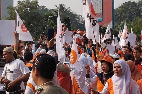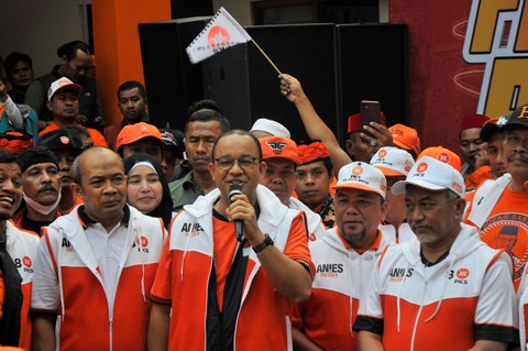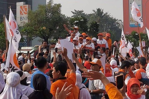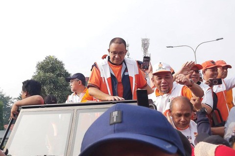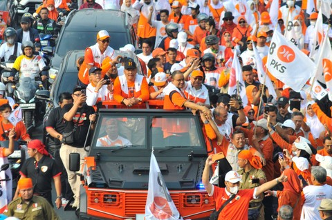 Anies beserta jajaran DPD PKS Bekasi pun tiba di Jalan Jenderal Sudirman, Kayuringin, Bekasi, sambil menaiki mobil bak terbuka dan dikonvoi menyapa para pendukungnya.