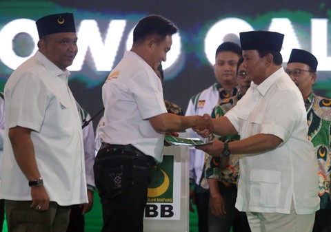 Partai Bulan Bintang (PBB) menggelar puncak Harlah ke-25 di ICE BSD, Tangerang, Minggu (30/7). Foto: Muhammad Iqbal/Antara FotoDalam acara itu, PBB mendeklarasikan Ketua Umum Partai Gerindra, Prabowo Subianto, sebagai capres yang akan diusung dalam kontestasi Pilpres 2024. Foto: Muhammad Iqbal/Antara FotoDeklarasi dukungan disampaikan Sekjen PBB, Afriansyah Noor, yang membacakan SK dukungan PBB kepada Prabowo Subianto sebagai capres di Pilpres 2024. Foto: Muhammad Iqbal/Antara FotoUsai membacakan SK, kemudian dilanjut pembacaan dan penyerahan naskah deklarasi dari Ketua Umum PBB Yusril Ihza Mahendra kepada Prabowo Subianto didampingi Sekjen Partai Gerindra Ahmad Muzani dan Sekjen PBB Afriansyah Noor. Foto: Muhammad Iqbal/Antara FotoDalam sambutannya, Ketua Umum PBB, Yusril Ihza Mahendra menyebut dukungan kepada Prabowo bukan hanya kalkulasi rasional saja. Foto: Muhammad Iqbal/Antara Foto