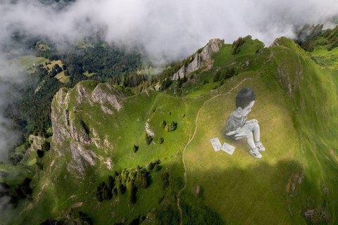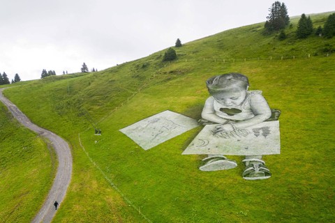 Di lereng gunung di Desa Villars-sur-Ollon, Swiss, seorang seniman menggunakan kapur dan arang melukis dua lukisan raksasa anak-anak yang sedang membuat sketsa— menggambarkan bagaimana mereka melihat dunia luas di sekitar mereka.