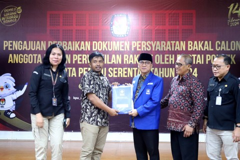 Wakil Ketua Umum PAN, Yandri Susanto, menyerahkan dokumen perbaikan Bacaleg dari Partai PAN di Gedung KPU, Jakarta, pada Minggu (9/7).