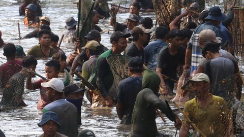 Sejumlah warga menangkap ikan saat tradisi Grobyak Ikan di Sumber Gundi, Desa Tanjung, Kediri, Jawa Timur, Minggu (30/7). Foto: Prasetia Fauzani/Antara FotoTradisi menangkap ikan itu dilakukan hanya pada bulan Suro penanggalan Jawa. Foto: Prasetia Fauzani/Antara FotoAcara tersebut dirayakan sebagai cara warga sekitar memberikan waktu ikan berkembang biak agar ekosistem tetap lestari. Foto: Prasetia Fauzani/Antara FotoIkan tersebut hanya dipanen setiap satu tahun sekali. Foto: Prasetia Fauzani/Antara Foto