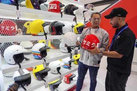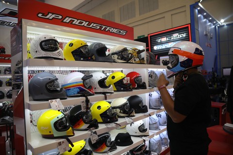 Selain memperlihatkan teknologi mobil, bus serta motor terbaru, pengunjung GIIAS 2023 juga dapat membeli berbagai perlengkapan pendukung otomotif lainnya seperti helm.