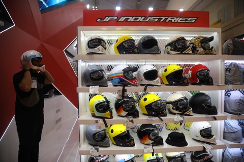 Pengunjung melihat koleksi helm JP Industries saat GAIKINDO Indonesia International Auto Show (GIIAS 2023) di ICE BSD, Tangerang, Sabtu (13/8/2023). Foto: Aditia Noviansyah/kumparan
