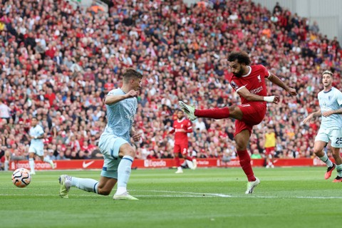 Pemain Liverpool Mohamed Salah merayakan gol pertama mereka dengan Cody Gakpo dan Luis Diaz aat hadapi AFC Bournemouth di Stadion Anfield, Liverpool, Inggris, Sabtu (19/8/2023). Foto: David Klein/REUTERS