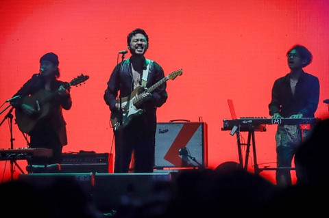 Bernyanyi di panggung berlatar merah, Pamungkas juga membawakan lagu berjudul "Live Forever".