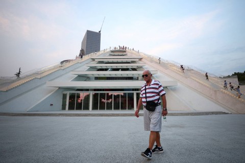Wisatawan mengunjungi piramida yang didesain ulang yang dulunya merupakan museum yang dibangun untuk menghormati mendiang diktator Komunis Enver Hoxha, di Tirana, Albania. Foto: Florion Goga/REUTERS