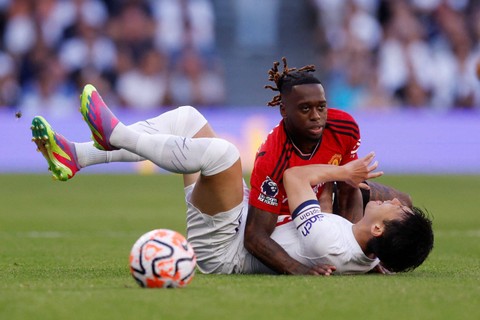 Pemain Tottenham Hotspur Son Heung-min berebut bola dengan pemain Manchester United Aaron Wan-Bissaka pada pertandingan Liga Inggris di Tottenham Hotspur Stadium, London, Inggris, Sabtu (19/8/2023). Foto: Andrew Couldridge/REUTERS