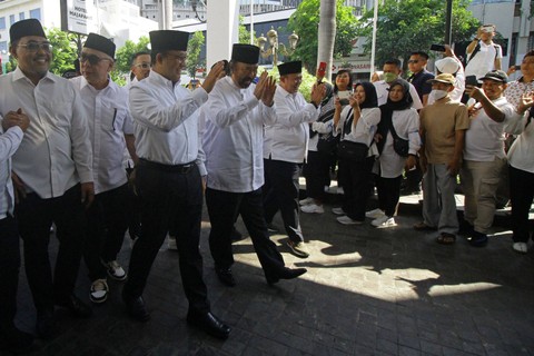 Keduanya pun langsung meneriakkan kata 'Merdeka' sebanyak dua kali. Setelah itu, Anies-Cak Imin melambaikan tangan kepada para relawan serta masyarakat yang melintas di depan Hotel Majapahit.