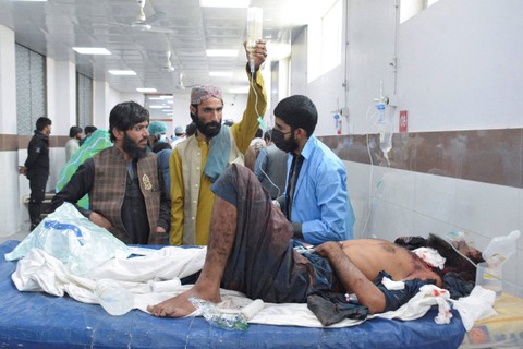 Petugas medis memindahkan seorang pria, yang terluka dalam ledakan di Mastung, dari ambulans di luar rumah sakit di Quetta, Pakistan 29 September 2023. Foto: REUTERS/Stringer