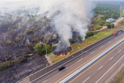Api membakar lahan perkebunan kelapa sawit di sisi Jalan Tol Trans Sumatera (JTTS) ruas Palembang-Indralaya KM15 Palem Raya, Ogan Ilir (OI), Sumatera Selatan, Jumat (22/9/2023). Foto: Nova Wahyudi/ANTARA FOTO