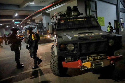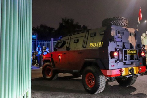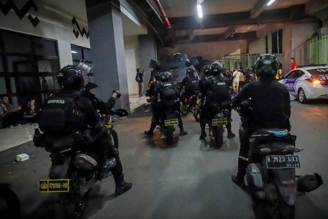 Polisi menerjunkan 4 mobil rantis untuk mengamankan pemain dan ofisial.