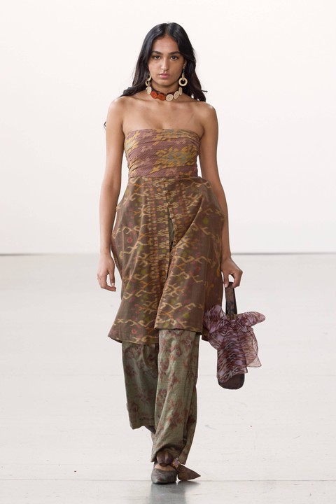 Didiet juga mengangkat budaya Sulawesi. Ia menuangkannya dalam bentuk bralette dan outer dengan siluet oversized yang terinspirasi dari baju Bodo.