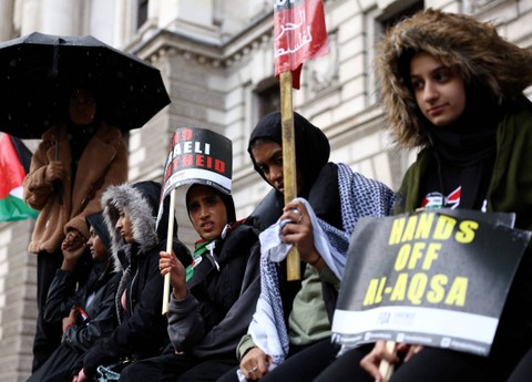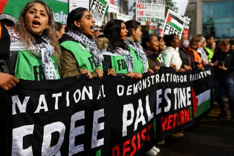 Demonstan aksi dukung warga Palestina di Gaza, di tengah konflik yang sedang berlangsung antara Israel dan kelompok Islam Palestina Hamas, di London, Inggris, Sabtu (21/10/2023). Foto: Hannah McKay/REUTERS