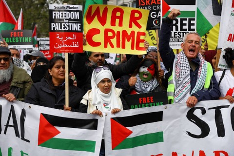 Sekitar 100.000 orang bergabung dalam demonstrasi pro-Palestina di pusat kota London pada Sabtu (21/10), berbaris melalui ibu kota Inggris untuk menuntut gencatan senjata segera di Gaza setelah serangan Hamas terhadap Israel dua minggu lalu.