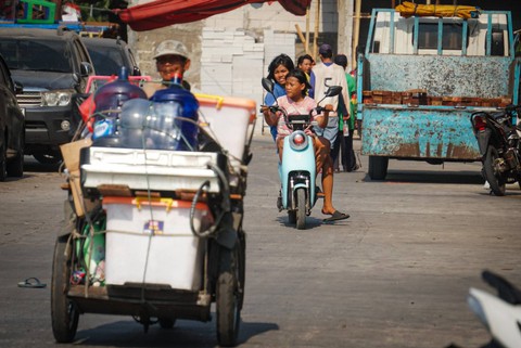 Aktivitas warga menggunakan kendaraan listrik di kawasan Kalibaru, Cilincing, Jakarta Utara pada Minggu (8/10/2023). Foto: Iqbal Firdaus/kumparan