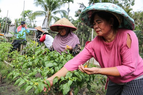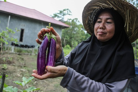 Kelompok Wanita Tani (KWT) Tampelas Raya merawat tanaman sayur terong yang ditanam di atas tanah bekas lahan gambut pada lahan percontohan (Demplot) di Desa Mantangai Hilir, Kapuas, Kalimantan Tengah. Foto: Makna Zaezar/ANTARA FOTO