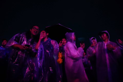 Meski diguyur hujan, penonton tampak antusias. Mereka berkerumun di depan Joyland Stage saat Maliq & D'Essentials tampil.