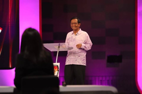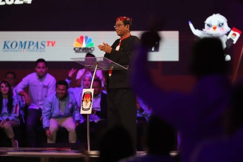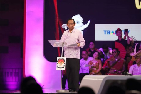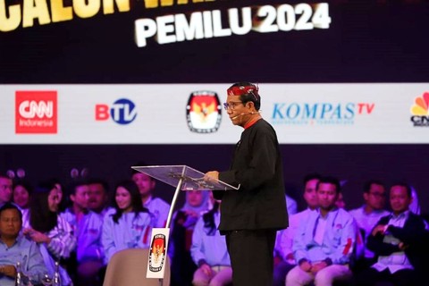Cawapres 03 Mahfud MD mengganti pakaiannya dalam debat cawapres di JCC, Senayan, Jakarta Pusat, Jumat (22/12) malam. Foto: Akbar Nugroho Gumay/ANTARA FOTOSejak awal tiba di lokasi debat, Mahfud mengenakan pakaian ada Madura. Foto: Iqbal Firdaus/kumparanDia mengenakan kaus bergaris merah putih lengkap dengan ikat kepala. Foto: Akbar Nugroho Gumay/ANTARA FOTOMahfud sempat sedikit terlambat naik ke atas panggung karena mengganti pakaian. Foto: Iqbal Firdaus/kumparanMemasuki sesi keenam atau terakhir yakni closing statement, Mahfud mengganti baju dari pakaian adat khas Madura, menggunakan kemeja pink bertuliskan tas tes. Foto: Iqbal Firdaus/kumparanDalam closing statemennya, Mahfud menyampaikan 21 program unggulan Ganjar-Mahfud. Foto: Iqbal Firdaus/kumparanPaslon 03 ini menjanjikan anggaran Rp 2.500 T untuk merealisasikan program itu. Foto: Iqbal Firdaus/kumparan