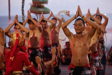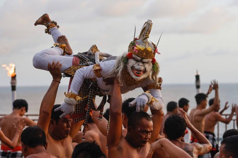 Para wisatawan lokal maupun mancanegara menikmati pertunjukan teater tari Kecak "Titi Situbanda" di Pantai Melasti, Bali, jelang Akhir tahun 2023. Foto: David Gannon / AFPKepala Kantor Otoritas Bandara Wilayah IV Bali Agustinus Budi Hartono menyatakan jelang libur Natal dan Tahun Baru kali ini akan terus mendongkrak kunjungan ke Bali hingga sekitar 20 persen. Foto: David Gannon / AFPFrekuensi kedatangan wisatawan dari rata-rata 58.000 per hari bertambah menjadi 60.000 per hari. Foto: David Gannon / AFPFoto: David Gannon / AFPFoto: David Gannon / AFP