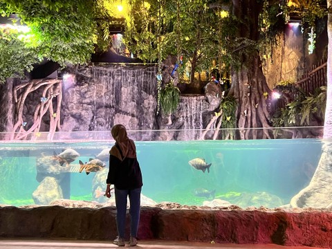 Pengunjung merekam ikan di akuarium BXSea, Bintaro, Tangerang Selatan, Banten, Jumat (15/12/2023). Foto: Sulthony Hasanuddin/Antara Foto