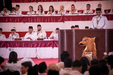 Ketua Umum Partai Gerindra sekaligus Calon Presiden nomor urut 2 Prabowo Subianto menghadiri Rapat Koordinasi Nasional (Rakornas) Partai Gerindra di Jakarta Internasional Expo (JIExpo), Kemayoran, Jakarta, Jumat (15/12).