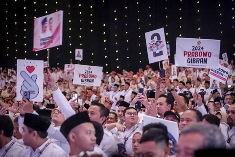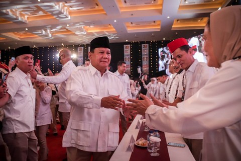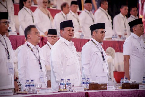 Ketua Dewan Pembina dan Ketua Umum Partai Gerindra sekaligus Capres nomor urut 2, Prabowo Subianto (tengah), menghadiri Rakornas Partai Gerindra di JIExpo, Kemayoran, Jakarta Pusat, Jumat (15/12/2023). Foto: Jamal Ramadhan/kumparan
