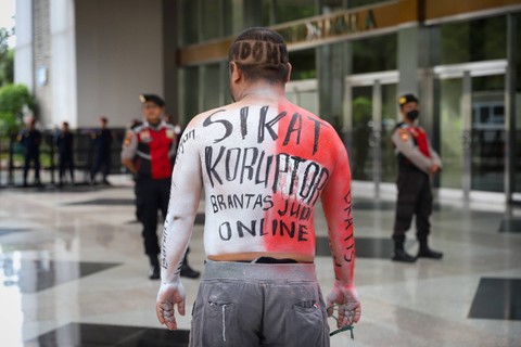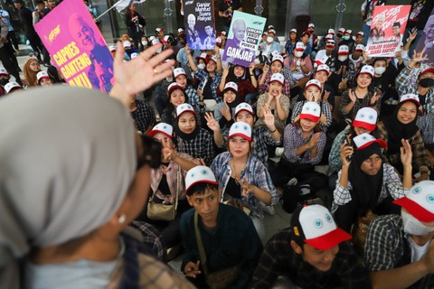 Pendukung paslon 03 membawakan yel-yel mereka di depan lokasi Debat Cawapres Pemilu 2024 di JCC Senayan, Jakarta, Minggu (21/1/2024). Foto: Iqbal Firdaus/kumparan