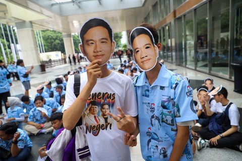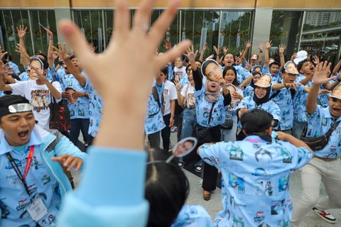 Sejumlah pendukung capres-cawapres meneriakkan yel-yel jelang Debat Keempat Pilpres 2024 di Jakarta Convention Center (JCC), Jakarta, Minggu (21/1).