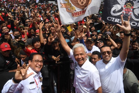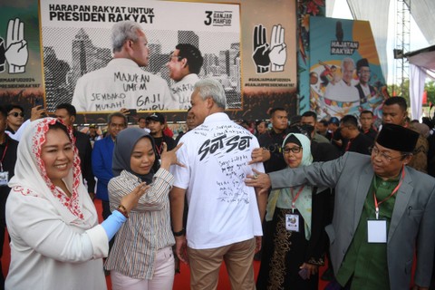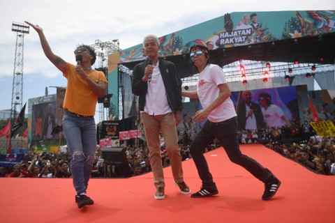 Calon presiden nomor urut 3 Ganjar Pranowo (tengah) bernyanyi dengan pendukungnya saat mengikuti kampanye terbuka bertajuk Hajatan Rakyat di Stadion Bima, Cirebon, Jawa Barat, Sabtu (27/1/2024). Foto: Akbar Nugroho Gumay/ANTARA FOTO