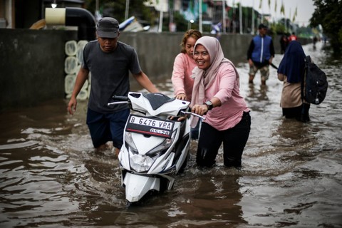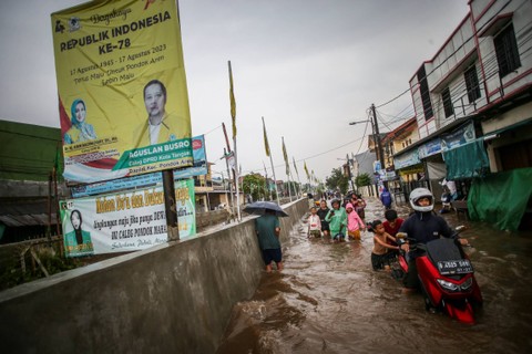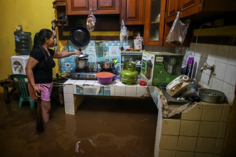Banjir menggenang di Perumahan Pondok Maharta, Tangerang Selatan, Banten, Sabtu (6/1). Foto: Rivan Awal Lingga/ANTARA FOTOBanjir yang menggenangi permukiman warga tersebut disebabkan tingginya curah hujan serta sistem drainase yang buruk. Foto: Rivan Awal Lingga/ANTARA FOTOWarga mengecek dapur rumahnya saat terjadi banjir di Perumahan Pondok Maharta, Tangerang Selatan, Banten, Sabtu (6/1/2024). Foto: Rivan Awal Lingga/ANTARA FOTOWarga melintasi banjir di Perumahan Pondok Maharta, Tangerang Selatan, Banten, Sabtu (6/1/2024). Foto: Rivan Awal Lingga/ANTARA FOTOWarga mendorong sepeda motornya saat banjir di Perumahan Pondok Maharta, Tangerang Selatan, Banten, Sabtu (6/1/2024). Foto: Rivan Awal Lingga/ANTARA FOTO