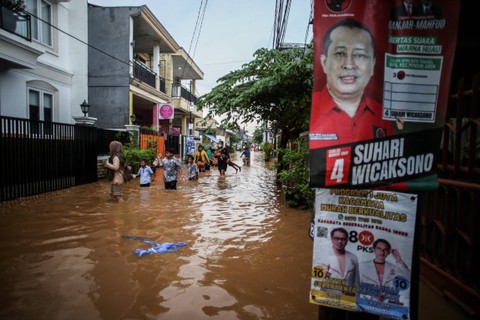 Sejumlah anak bermain saat terjadi banjir di Perumahan Pondok Maharta, Tangerang Selatan, Banten, Sabtu (6/1/2024). Foto: Rivan Awal Lingga/ANTARA FOTO