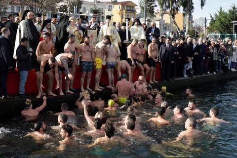Setelah kebaktian Epiphany tradisional di Gereja Patriarkal St. George, pemimpin spiritual umat Kristen Ortodoks dunia, Patriarki Ekumenis Bartholomew I melemparkan salib kayu ke dalam air untuk memulai perlombaan.