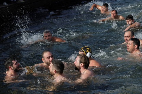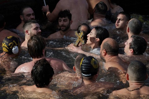 Puluhan perenang, termasuk orang-orang dari Yunani, Spanyol dan negara-negara lain, berkompetisi untuk mengambil salib tersebut.