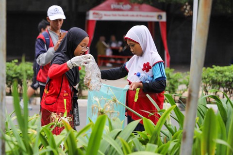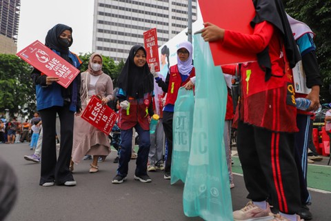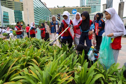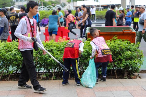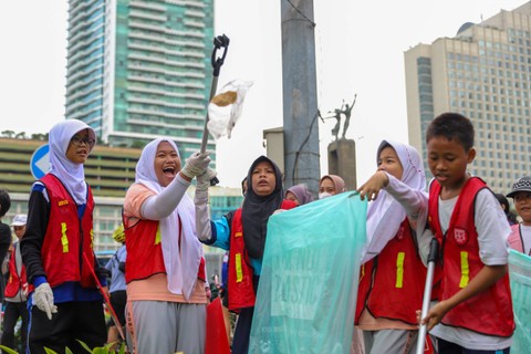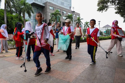 Sejumlah anak-anak yang tergabung dari sebuah komunitas mengumpulkan sampah di area Car Free Day (CFD) Bundaran HI, Jakarta, Minggu (25/2/2024). Foto: Iqbal Firdaus/kumparan