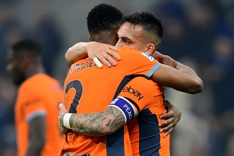 Pemain Inter Milan Lautaro Martinez merayakan gol keduanya bersama Marcus Thuram pada pertandingan pekan ke-24 Liga Italia, di San Siro, Milan, Italia, Jumat (16/2/2024). Foto: Daniele Mascolo/REUTERS