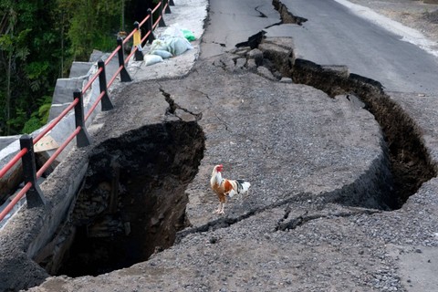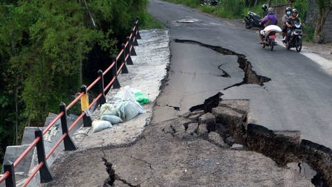 Sejumlah warga dan wisatawan mancanegara mengendarai sepeda motor melintasi jalan yang ambrol di Desa Taman Bali, Bangli, Bali, Minggu (18/2). Foto: Nyoman Hendra Wibowo/Antara FotoJalan umum yang menjadi akses wisata penghubung Kabupaten Bangli dan Kabupaten Gianyar tersebut ambrol pada Minggu (18/2) dini hari sekitar pukul 01.00 Wita. Foto: Nyoman Hendra Wibowo/Antara FotoJalan tersebut ambrol lantaran kondisi tanah yang labil. Foto: Nyoman Hendra Wibowo/Antara FotoImbasnya jalan tersebut tidak bisa dilintasi kendaraan roda empat, tidak ada korban dalam peristiwa itu. Foto: Nyoman Hendra Wibowo/Antara Foto