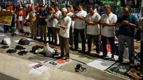 Sejumlah simpatisan capres-cawapres nomor urut 1 menunaikan salat subuh berjemaah sebelum kampanye akbar capres-cawapres nomor urut 1 Anies Baswedan dan Muhaimin Iskandar di Jakarta International Stadium (JIS), Jakarta, Sabtu (10/2/2024). Foto: Erlangga Bregas Prakoso/Antara Foto