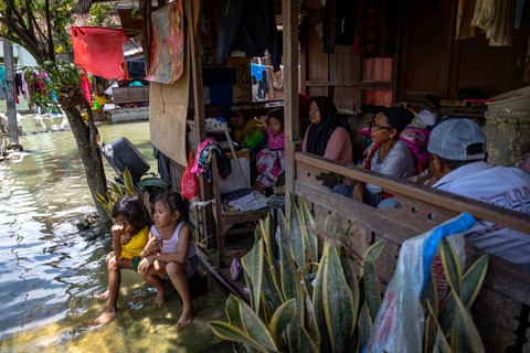 Warga menjemur barang rumah tangga yang masih bisa diselamatkan pascabanjir yang merendam rumah mereka di Desa Wonorejo, Kecamatan Karanganyar, Kabupaten Demak, Jawa Tengah, Minggu (18/2/2024). Foto: Aji Styawan/Antara Foto