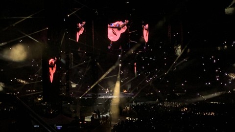 Hitungan mundur, Ed Sheeran melompat ke tengah panggung lengkap dengan gitar string kesayangannya sambil melempar senyum ke penonton.