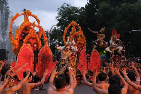 Sejumlah pemuda menampilkan fragmen tari saat pawai ogoh-ogoh pada Kasanga Festival 2024 di Denpasar, Bali, Jumat (1/3/2024). Foto: ANTARA FOTO/Nyoman Hendra Wibowo