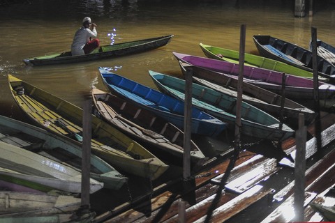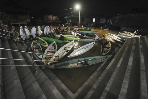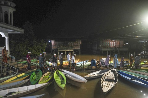 Foto: Pakai Perahu, Warga Jambi Tembus Banjir untuk Salat Tarawih di Masjid