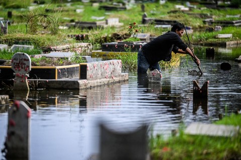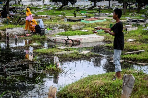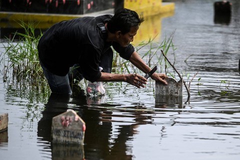 Umat Islam berdoa di depan makam keluarga dan kerabat dekat yang terendam banjir di Tempat Pemakaman Umum Semper, Jakarta, Minggu (3/3/2024). Foto: Rivan Awal Lingga/Antara Foto