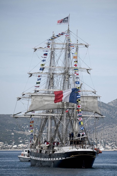Kapal Barque Belem tiga tiang abad ke-19 Prancis berlayar dari pelabuhan Piraeus dekat Athena dengan api Olimpiade di dalamnya untuk memulai perjalanannya ke Prancis (27/4/2024) Foto: Angelos Tzortzinis / AFP
