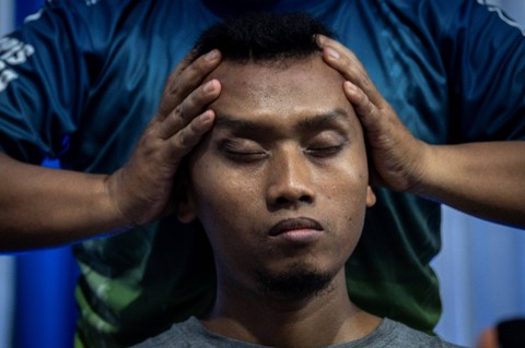 Terapis memijat pemudik sepeda motor di rest area UPPKB Losarang, Indramayu, Jawa Barat, Sabtu (6/4/2024). Foto: Bayu Pratama S/ANTARA FOTO