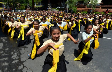 Sejumlah anak menarikan Tari Sekar Jempiring secara massal dalam rangkaian kegiatan Naluriku Menari di Denpasar, Bali, Sabtu (27/4/2024) Foto: Fikri Yusuf/ANTARA FOTOPementasan tari maskot Kota Denpasar itu dilakukan oleh 1.100 orang penari untuk merayakan Hari Tari Sedunia 2024. Foto: Fikri Yusuf/ANTARA FOTOPerayaan Hari Tari Sedunia ini tidak hanya melibatkan penari di Kota Denpasar saja namun seluruh penari Bali, Sulawesi, Sumatera, hingga Negara Kanada. Foto: Fikri Yusuf/ANTARA FOTOFoto: Fikri Yusuf/ANTARA FOTO
