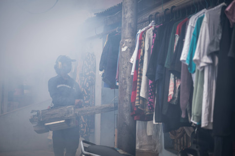Seorang petugas melakukan pengasapan (fogging) di kawasan permukiman, Kelurahan Grogol, Jakarta, Kamis (2/5). Foto: Bayu Pratama S/ANTARA FOTOPengasapan tersebut untuk memberantas nyamuk Aedes aegypti dalam upaya mencegah wabah demam berdarah dengue (DBD) di Jakarta. Foto: Bayu Pratama S/ANTARA FOTOKasus DBD di Indonesia meningkat pesat bila dibandingkan tahun 2023. Foto: Bayu Pratama S/ANTARA FOTOKementerian Kesehatan mencatat, hingga pekan ke-17 di 2024, sudah ada 88.583 kasus. Foto: Bayu Pratama S/ANTARA FOTO