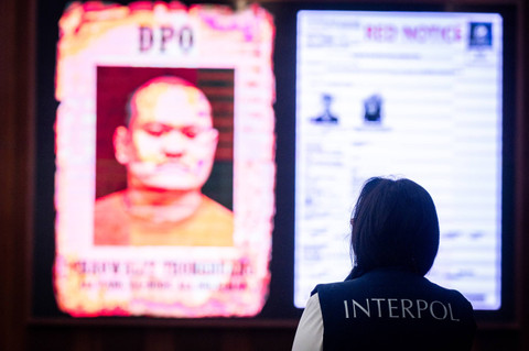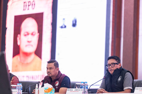 Seorang polisi berada dekat layar yang menampilkan gambar buronan Interpol Thailand Chaowalit Thongduang saat konferensi pers penangkapan buronan Interpol Thailand di Gedung Bareskrim Polri, Jakarta, Minggu (2/6/2024). Foto: Bayu Pratama S/ANTARA FOTO