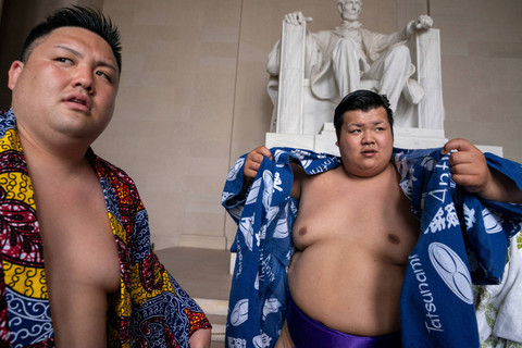 Pegulat sumo yang mengikuti acara pameran Sumo dan Sushi mengunjungi US Capitol selama tur kota menjelang acara malam mereka di Washington, AS, 28 Juni 2024. Foto: REUTERS/Nathan Howard