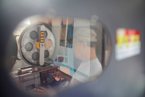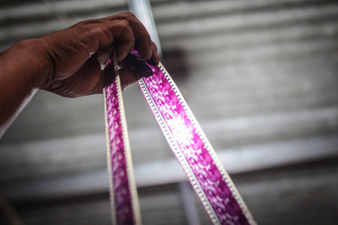Penyedia jasa layanan penyewaan film untuk layar tancap Nur Iyan melakukan perawatan film seluloid 35 milimeter (mm) koleksinya di kawasan Pamulang, Tangerang Selatan, Banten, Senin (29/7/2024). Foto: Darryl Ramadhan/kumparan